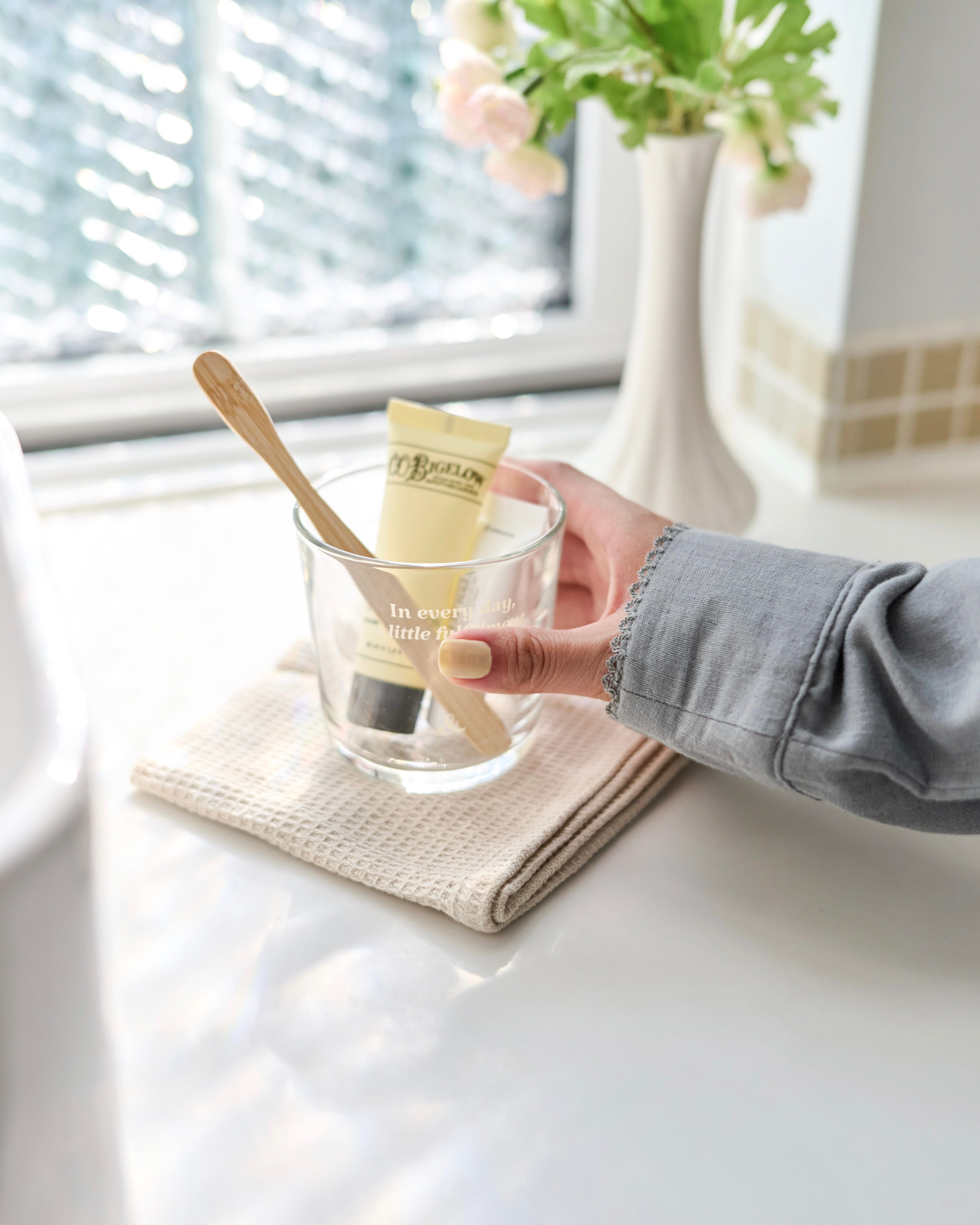 胸元の小さな刺繍がワンポイントになって、ナチュラルな中にさりげない可愛さを添えています。