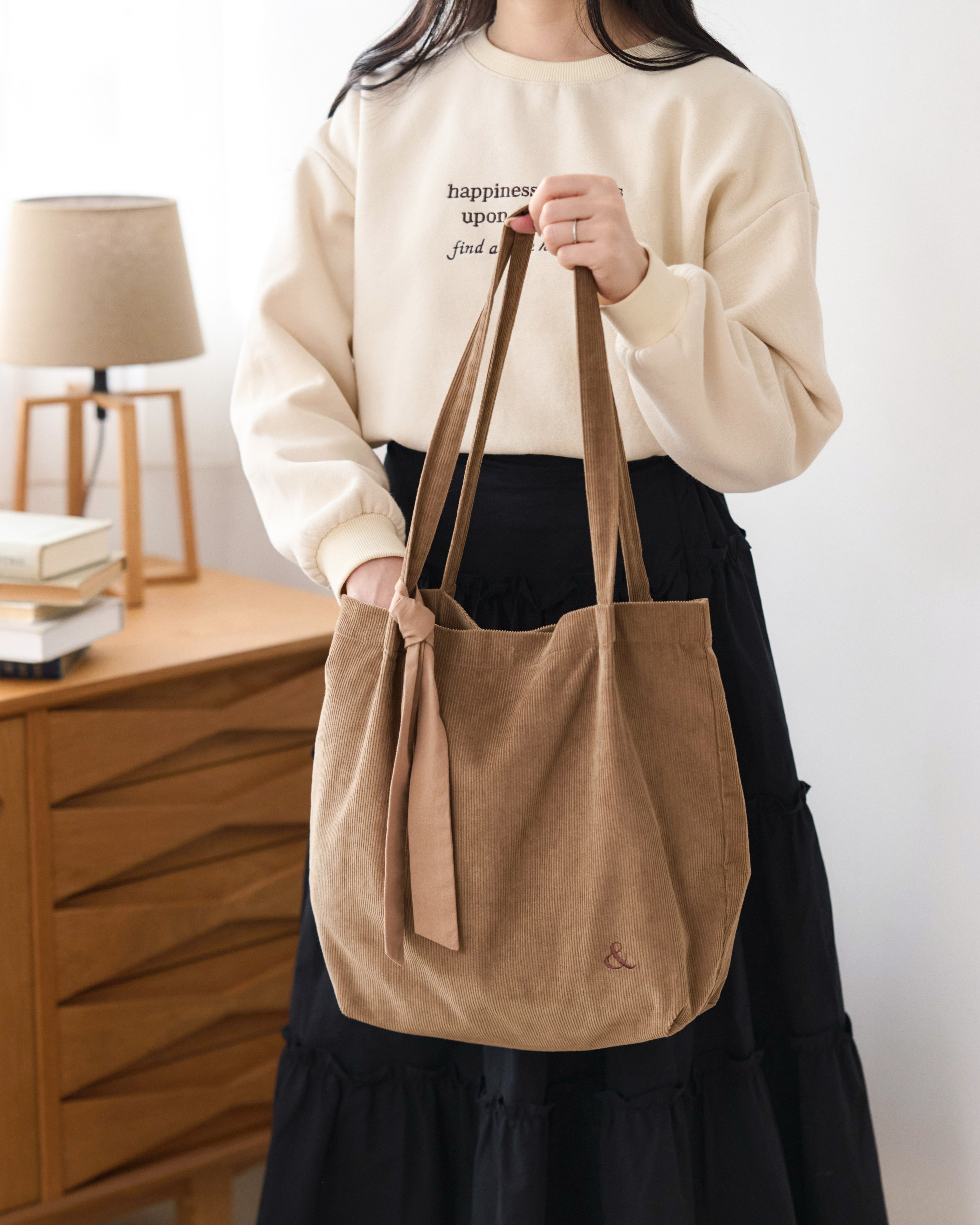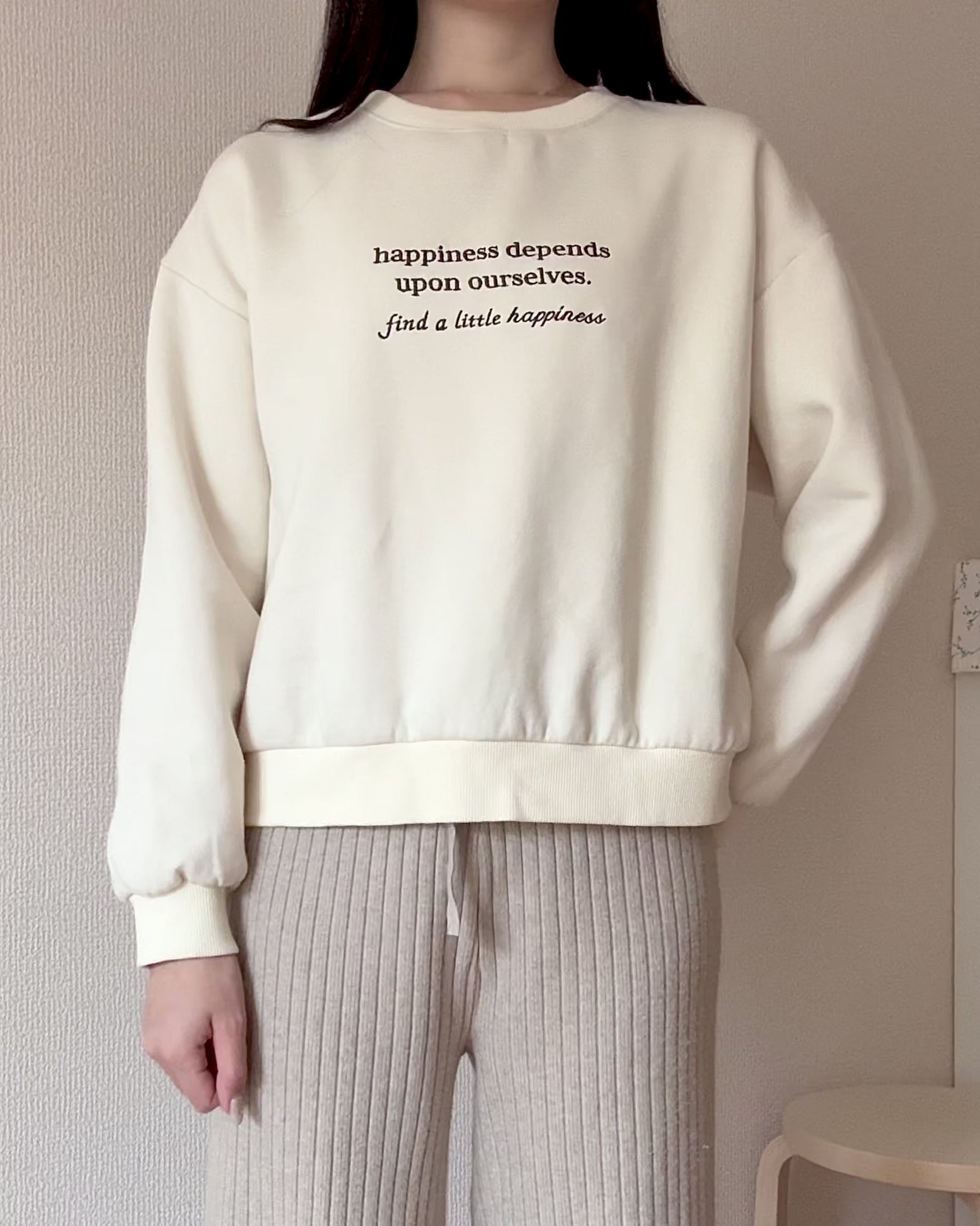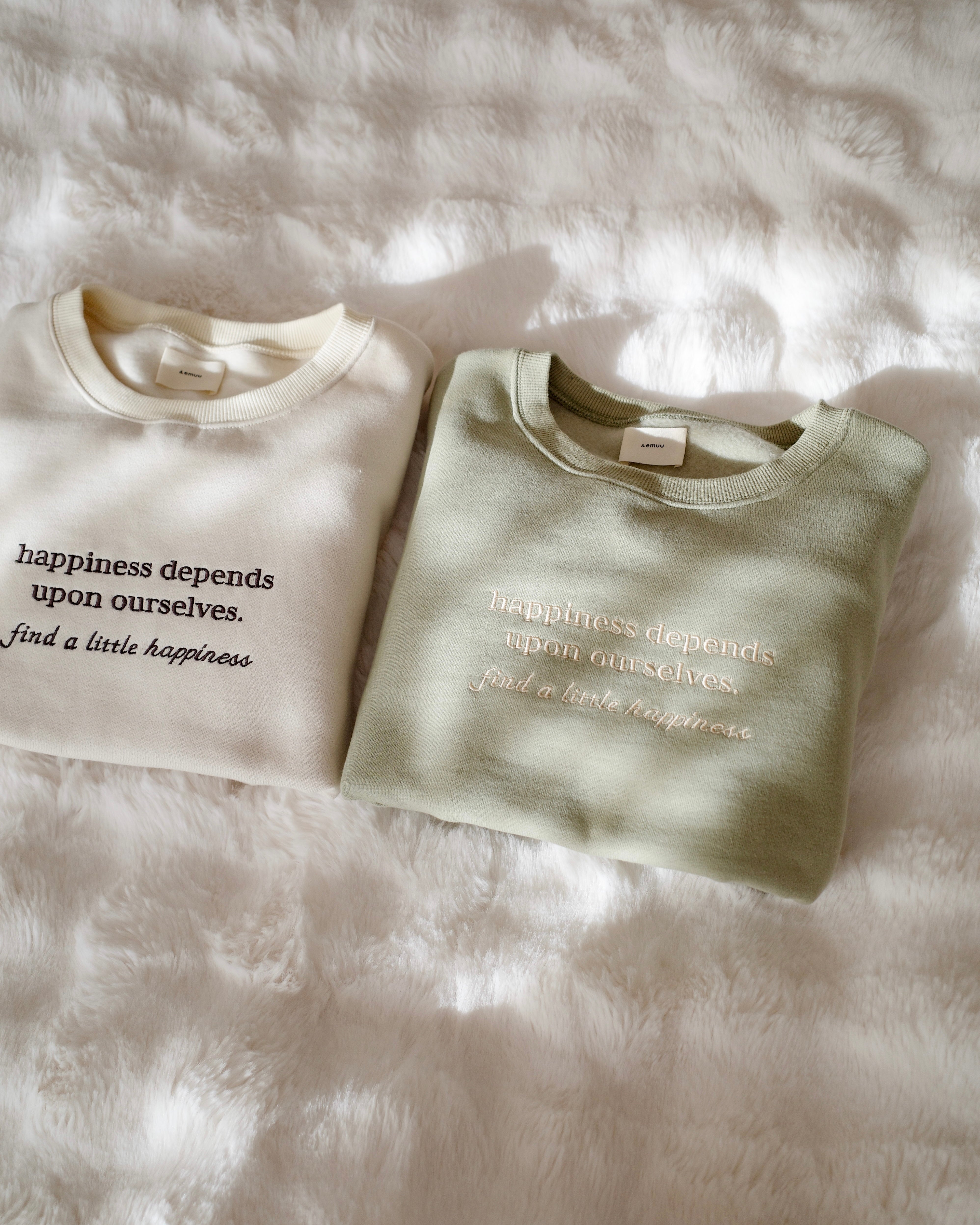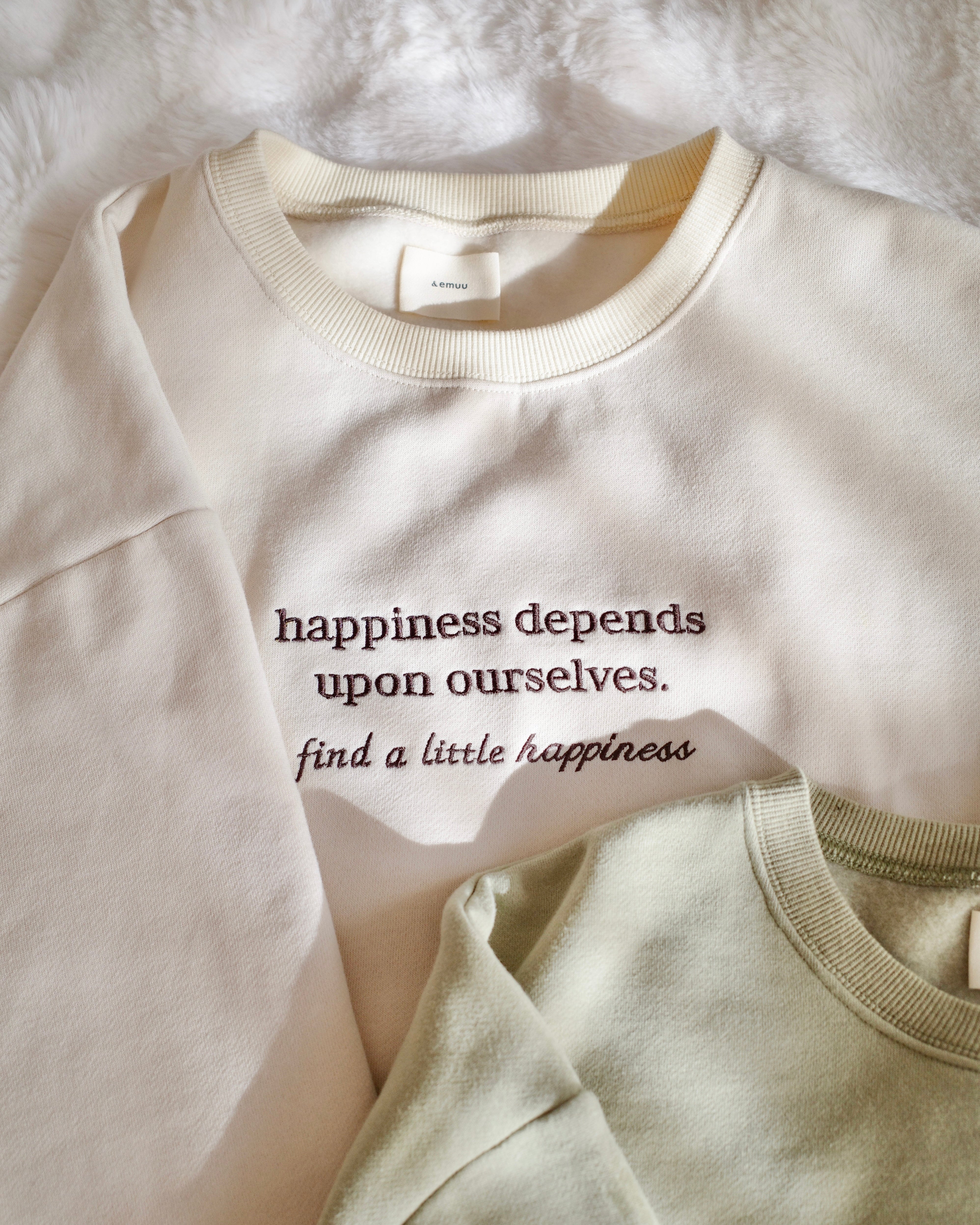 フロントには「happiness depends upon ourselves. find a little happiness.」の刺繍を、バックには小さな英文ロゴをあしらい、前後どちらから見てもさりげない可愛さを感じられる一枚です。