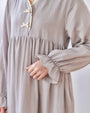 ウエスト位置で切り替えたギャザーが、体のラインを拾わず、リラックス感がありながらもすっきりとしたシルエットに仕上げています。
