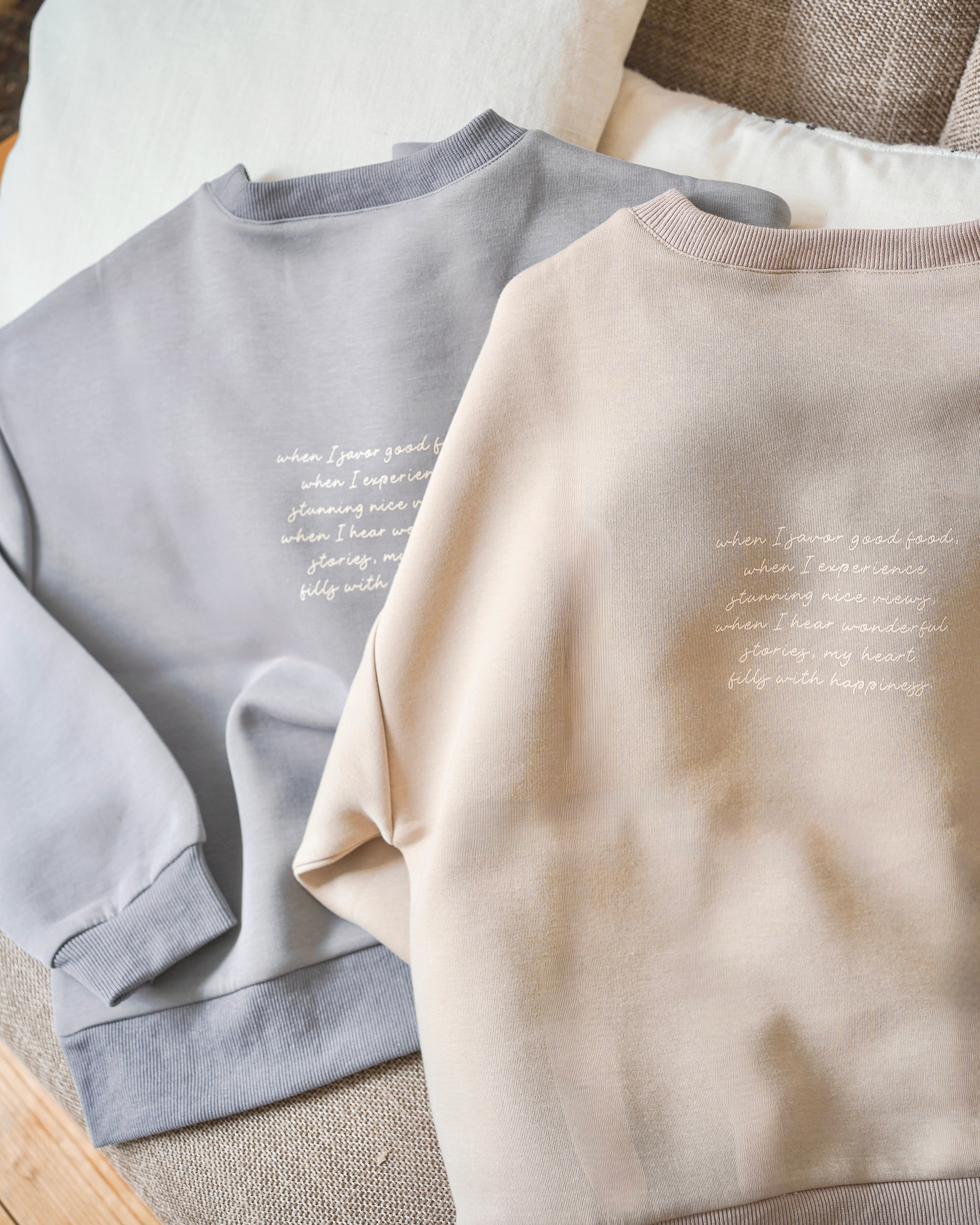 胸元には控えめな「and emuu」の刺繍ロゴ、背中には小さなメッセージを。