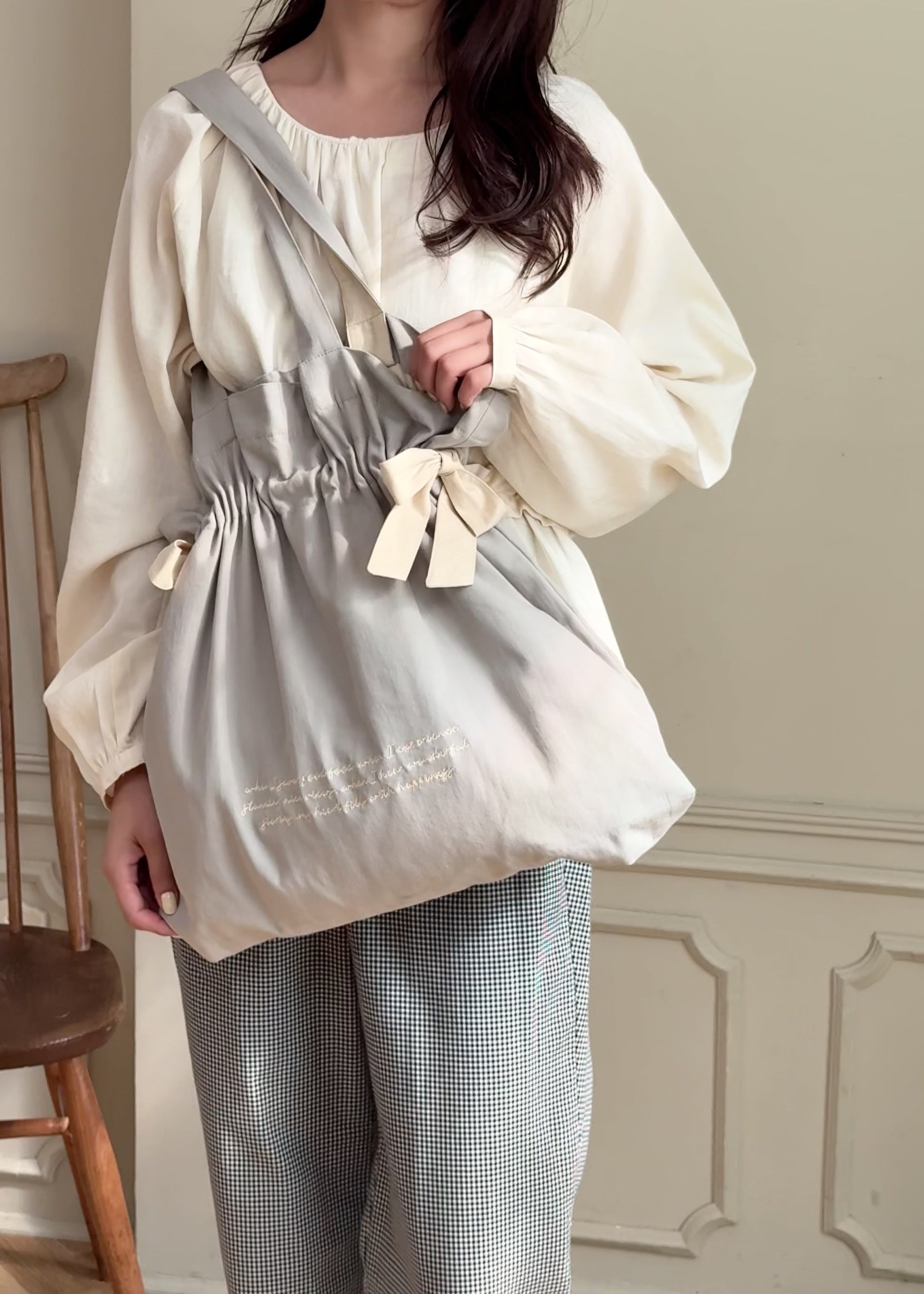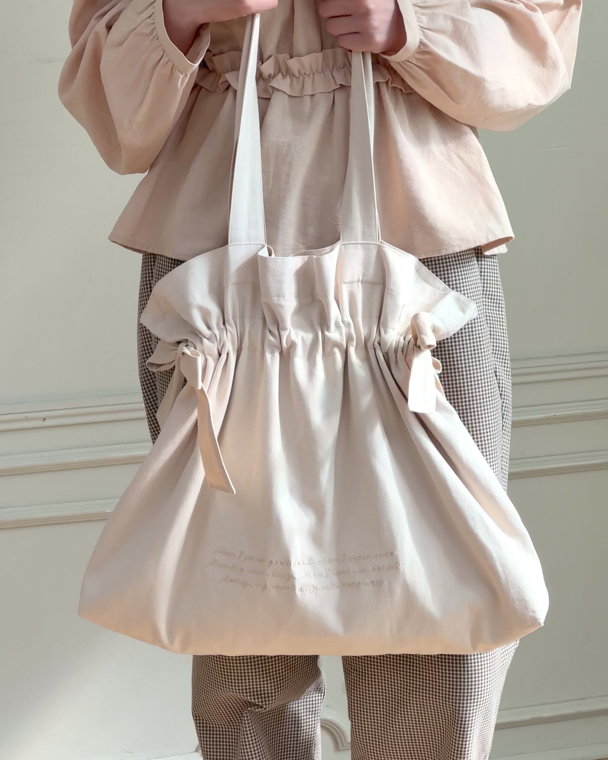 リボンとギャザーのデザインがポイントの、ナチュラルなキャンバストートバッグ。